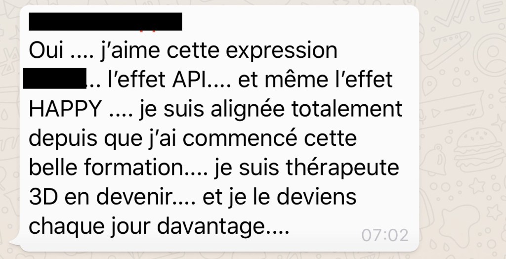 J’ai créé l’API, l’Academie Psychocorporelle Integrative avec la volonté de former comme j’aurais aimé être formée moi-même. J’ai ouvert ma propre école pour former à cette méthode qui n’est pas enseignée ailleurs. Un mélange de thérapies brèves, divers types d’hypnose dont l’hypnose psychocorporelle et l’hypnose profonde, PNL et coaching, systémique, psycho énergétique et neurosciences. Une méthode Psychocorporelle Integrative complète orientée vers les « solutions » pour accompagner vos clients dans un travail transverse sur toutes les dimensions de leur être.