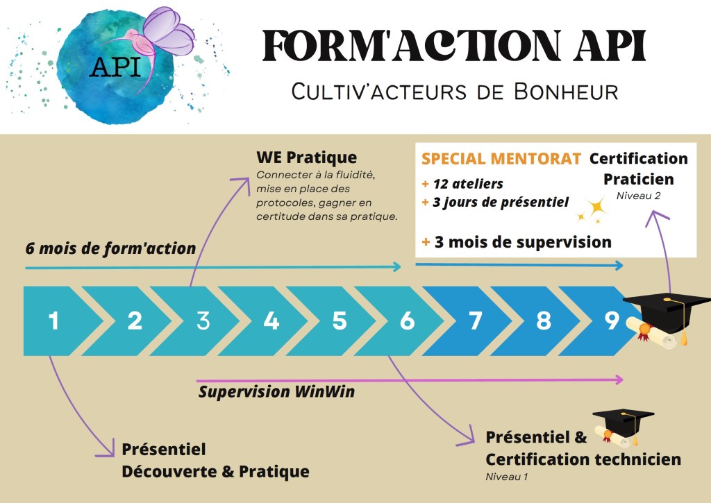 Devenir thérapeute et coach API: Certification de praticien Psychocorporel Intégratif en 9 mois. 80% a distance et 20% en présentiel (Lieu au calme pendant 1 semaine + 1 semaine à 6 mois d’intervalle, selon les cycles le lieu sera soleil ou verdure mais toujours studieux sans se prendre au sérieux). Possible 100% à distance avec des modules individuels de pratique en plus (me contacter pour les modalités spécifiques). Une partie de supervision individuelle+groupe est inclus dans la formation.
