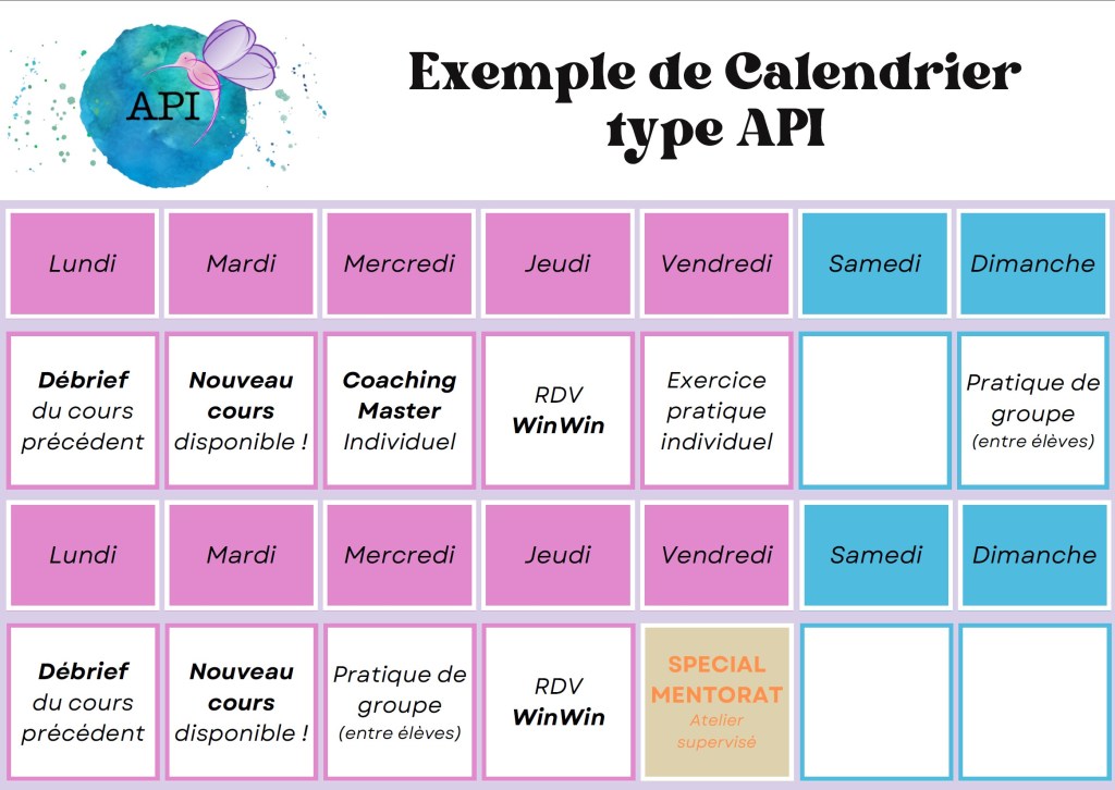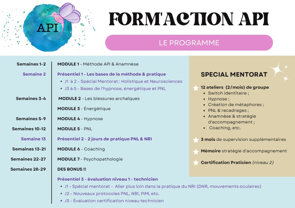 Pendant cette formation vous apprendrez un métier complet, une méthode efficiente et claire, vous aurez des workbooks et livrets récapitulatifs . Vous serez accompagnés individuellement pendant 6 mois par un Master dédié certifié API pour vous aider travailler sur vous-même, ce qui vous fera vivre de l’intérieur la méthode API.